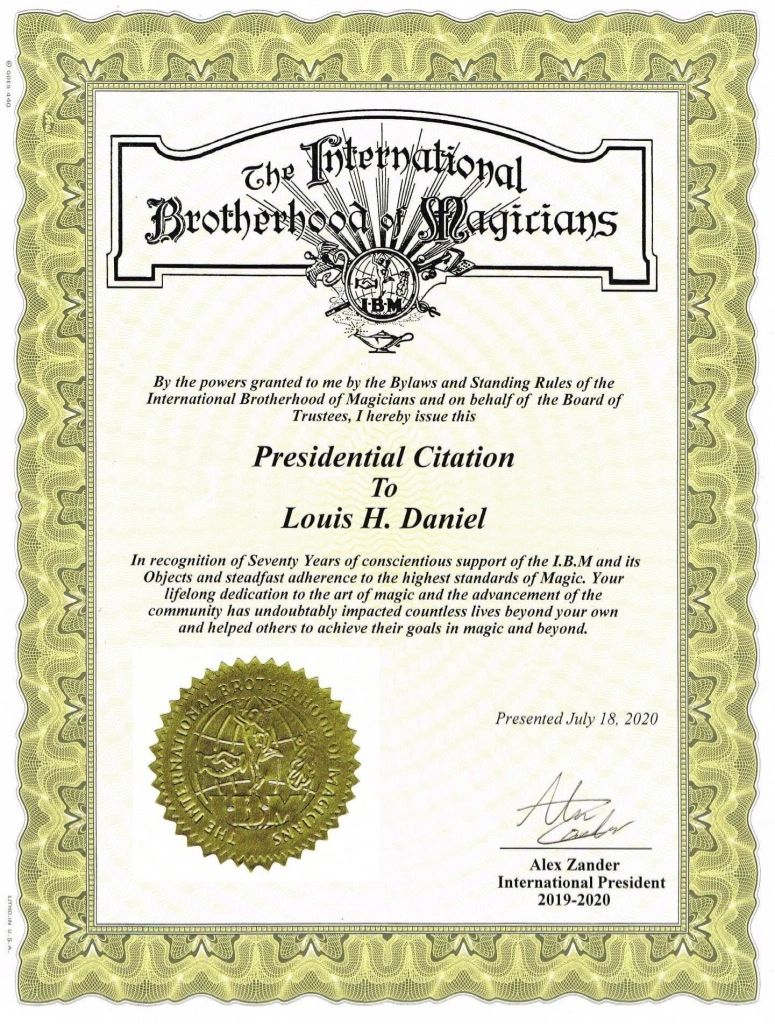Luis is recognized for his seventy concurrent years as a member of the International Brotherhood of Magicians "Ren Clark" Ring #15.